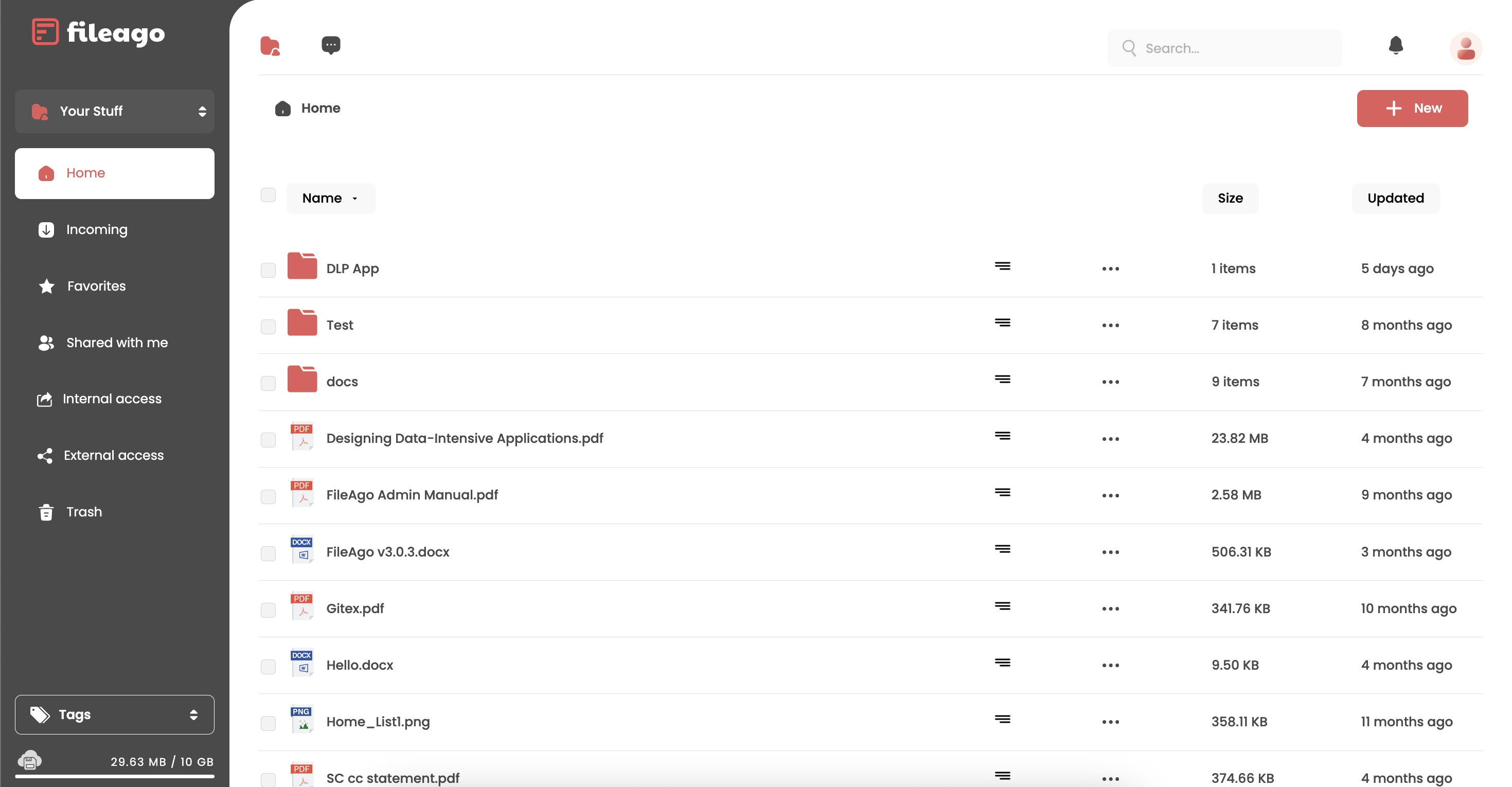The user’s home page where he/she can upload files is called Workspace. When a user logs into FileAgo, the user is presented with his personal workspace. Files belonging to the user are organized into different folders for easy access.